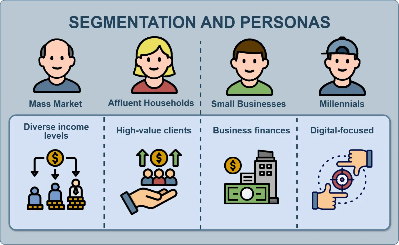 | 1 | Digital-First Millennials | Convenience and control through digital solutions | Fully online: mobile wallets, P2P, crypto payments | Mobile apps, social media, referral programs |
