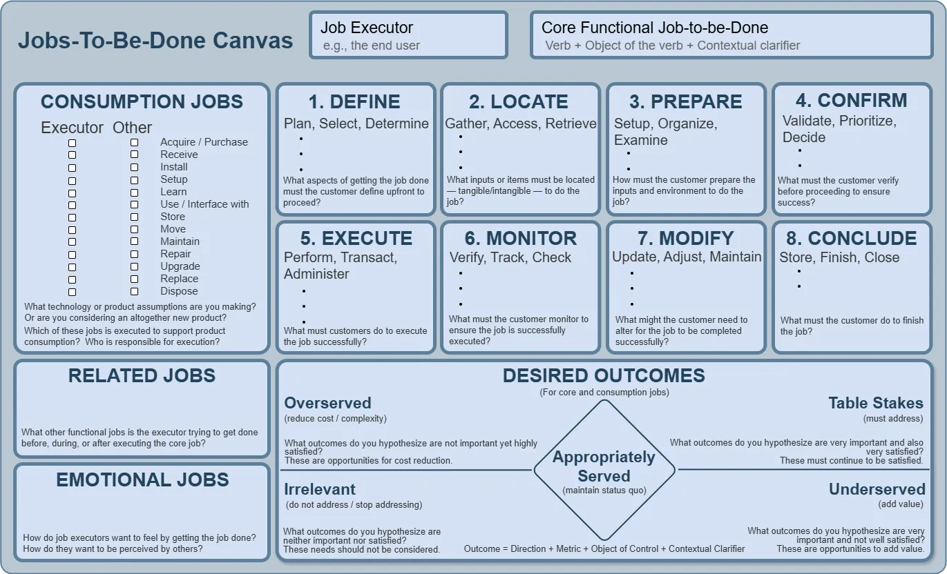 The JTBD Canvas helps you capture not just what the user does, but why they do it and what matters to them in the end.