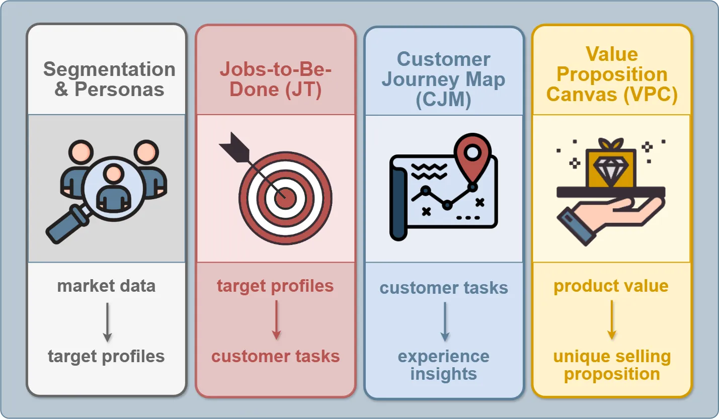| Segmentation & Personas | Deep understanding of customers and their context | Jobs-to-Be-Done (defining functional and emotional jobs) |