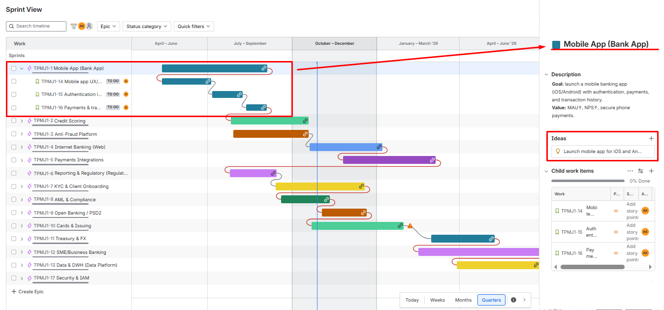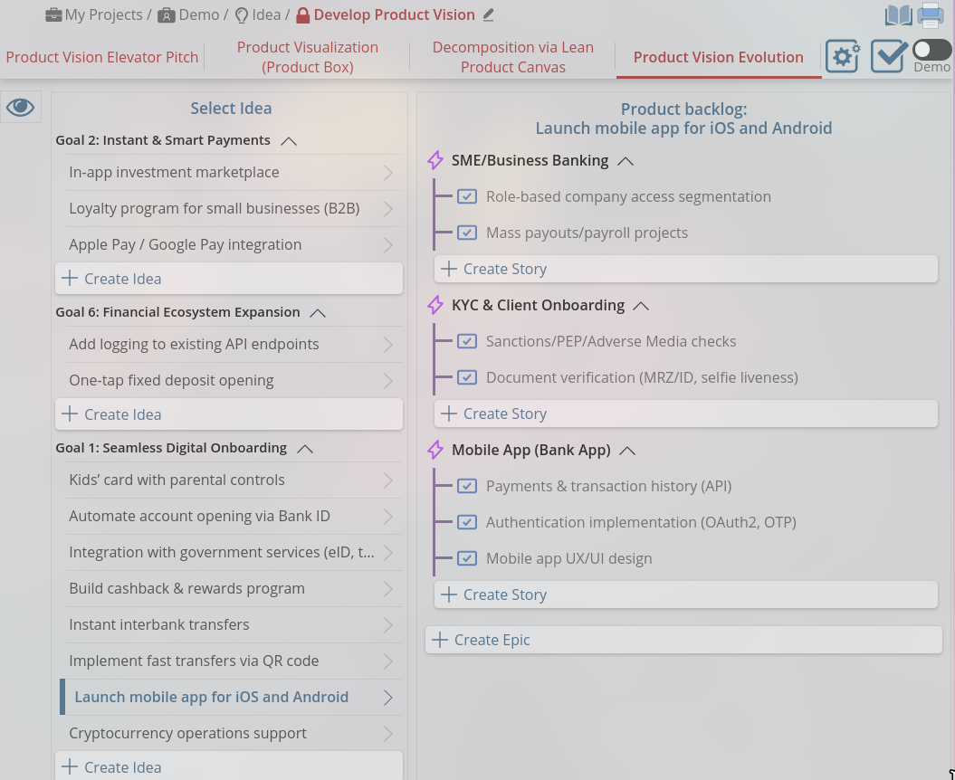 Create a hierarchy: Epic → Story and link it to the corresponding idea.