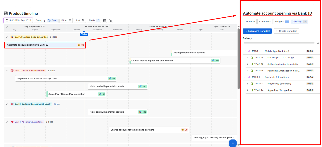 Link each Idea (Jira Product Discovery) to a delivery Epic (Jira Software). Break the epic into Stories.