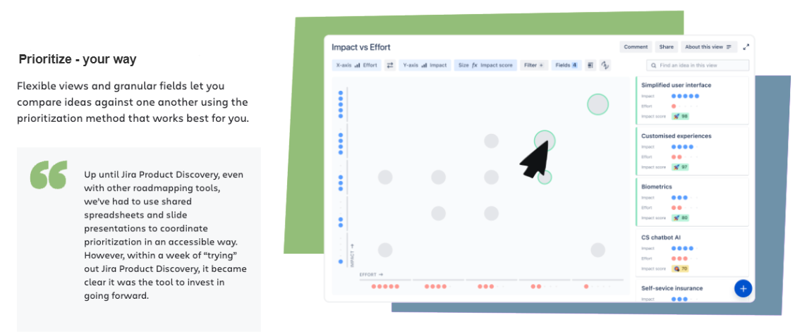 Use the fields Impact / Effort, Confidence, RICE, as well as Team Voting — all available out of the box.