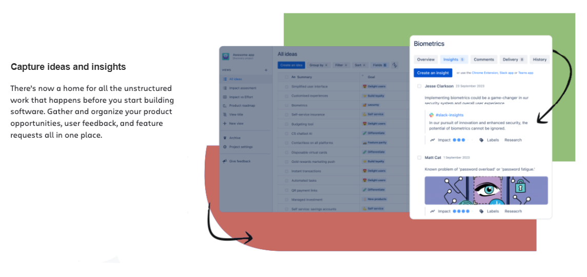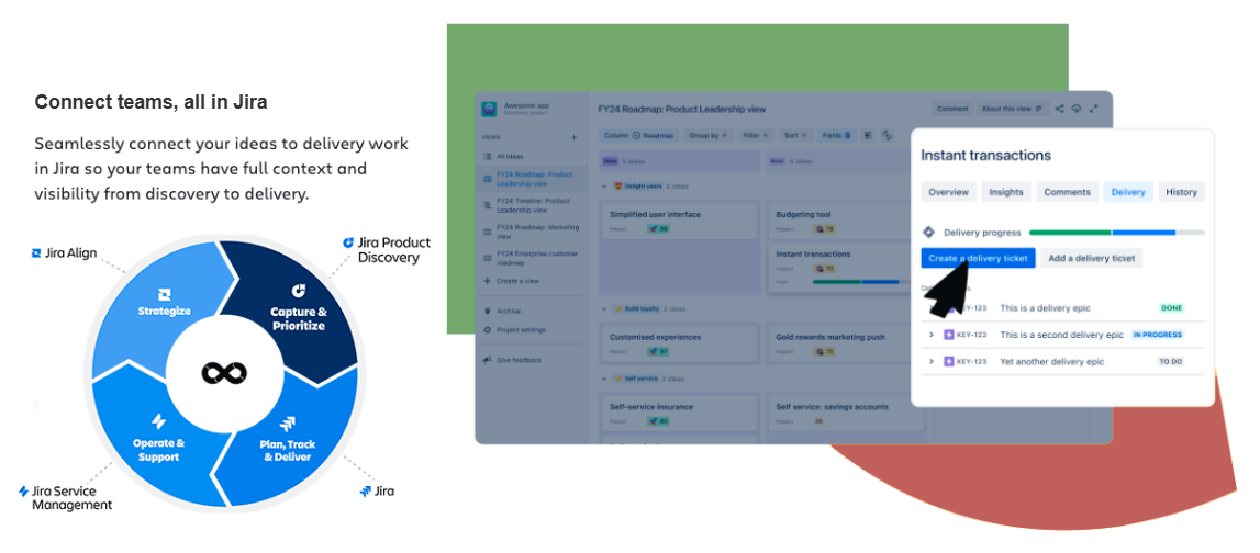 Link each Idea (Jira Product Discovery) to a delivery Epic (Jira Software). Break the epic into Stories.