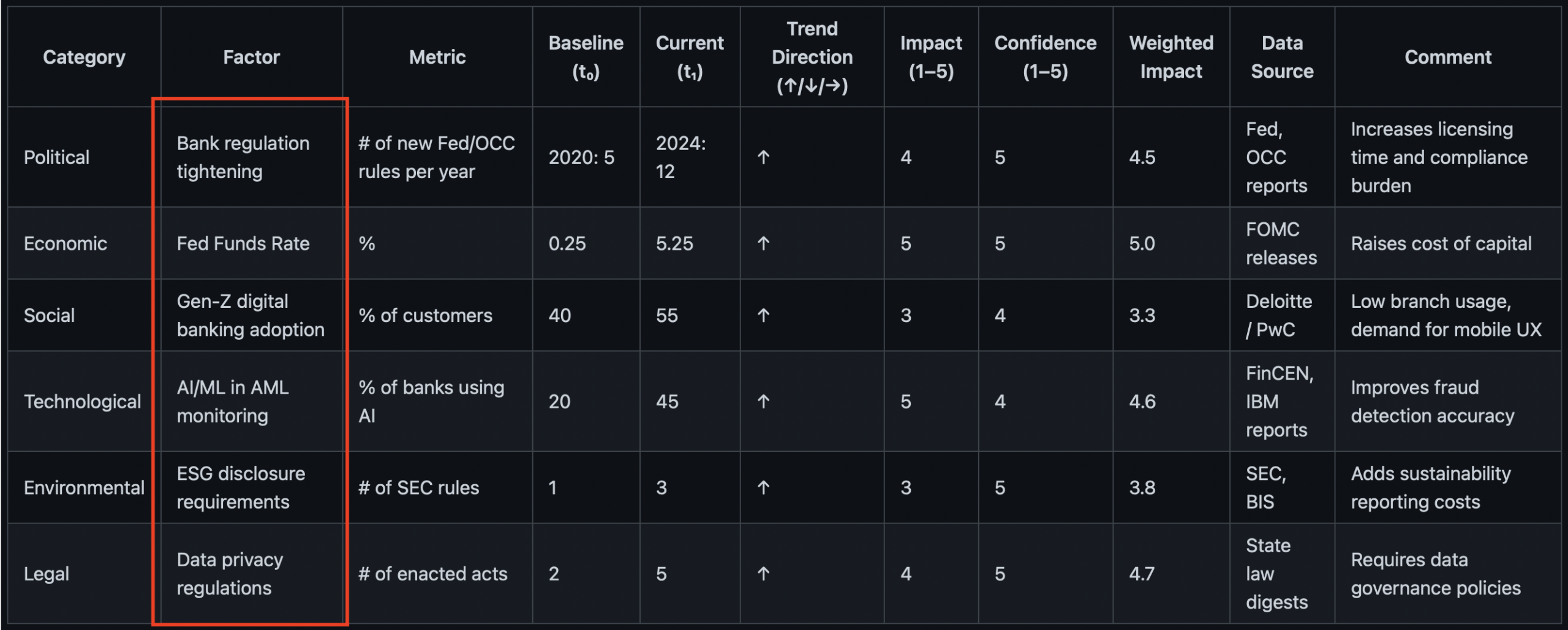 document concrete factors + validate them with data and sources + make an initial assessment of trend/impact/confidence.