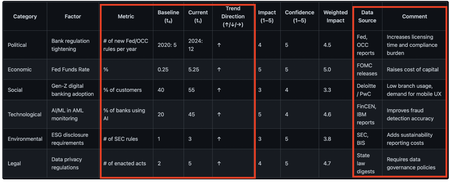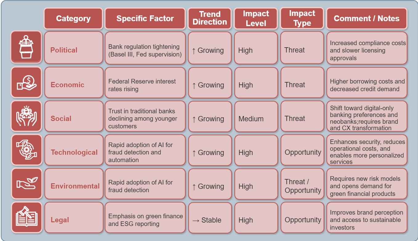 This is a real table demonstrating how external factors are distributed across the six PESTEL categories. The sample case, “launching a bank in the USA,” reflects actual data on regulation, interest rates, ESG, and AI.