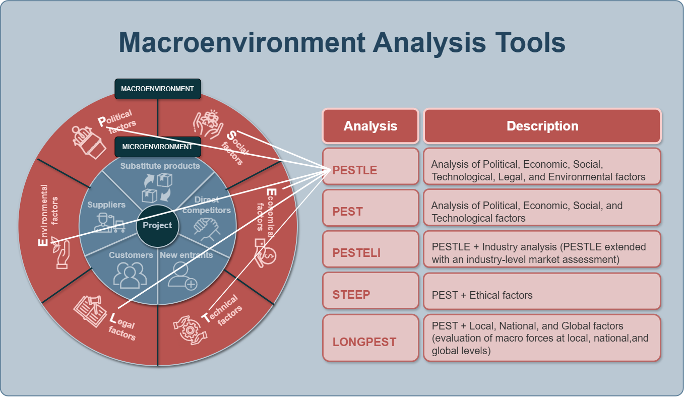 Any market analysis begins with the macroenvironment — the outer circle of external factors that influence all industry players simultaneously.