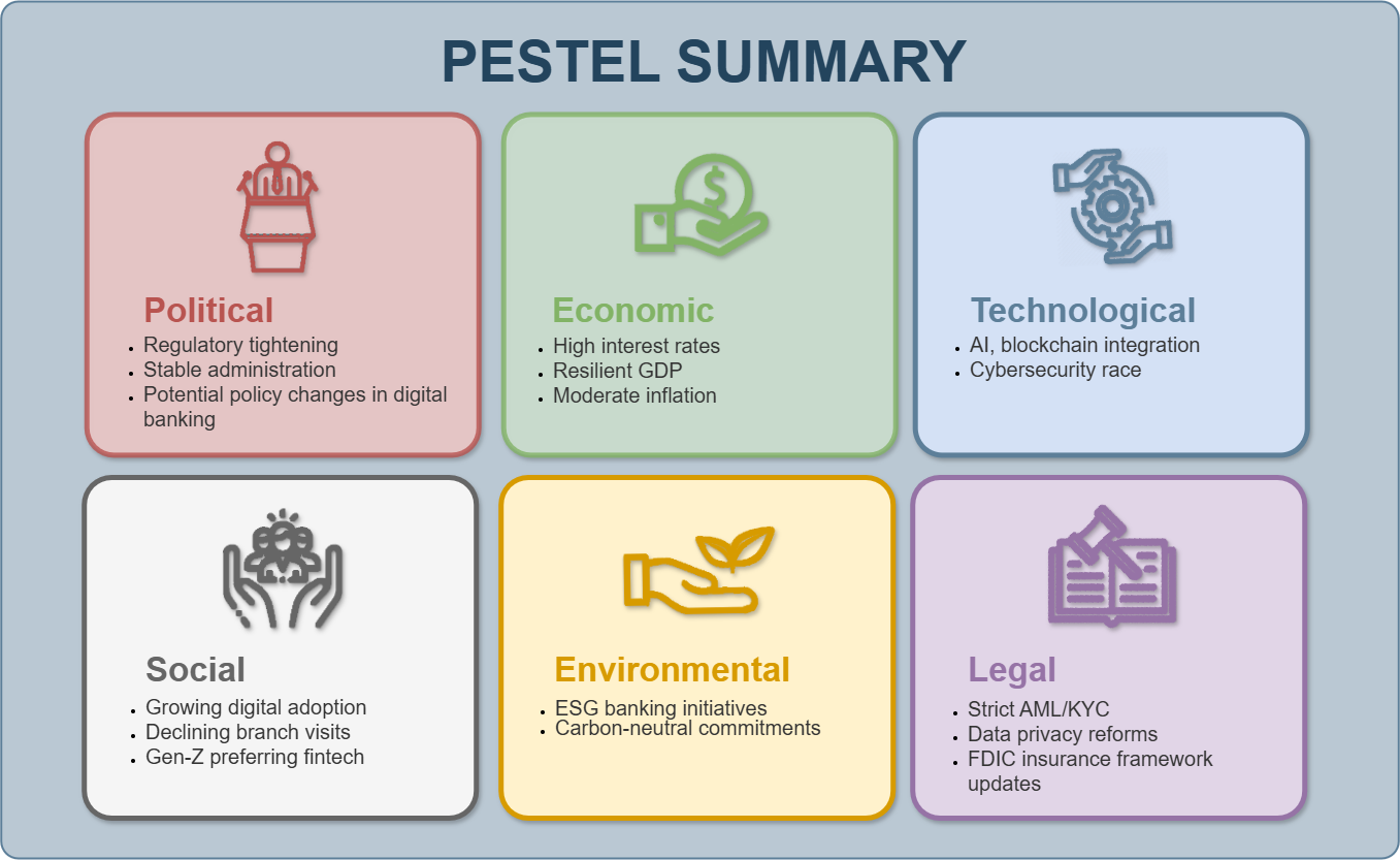 The first visual block — “PESTEL Analytical Table” and “PESTEL Summary Dashboard” — shows which specific factors are relevant for the U.S. banking industry: