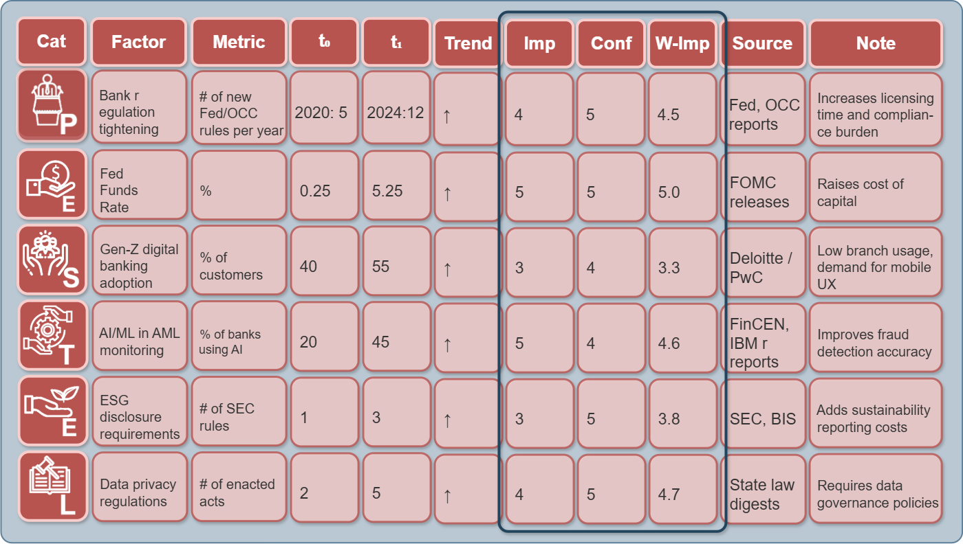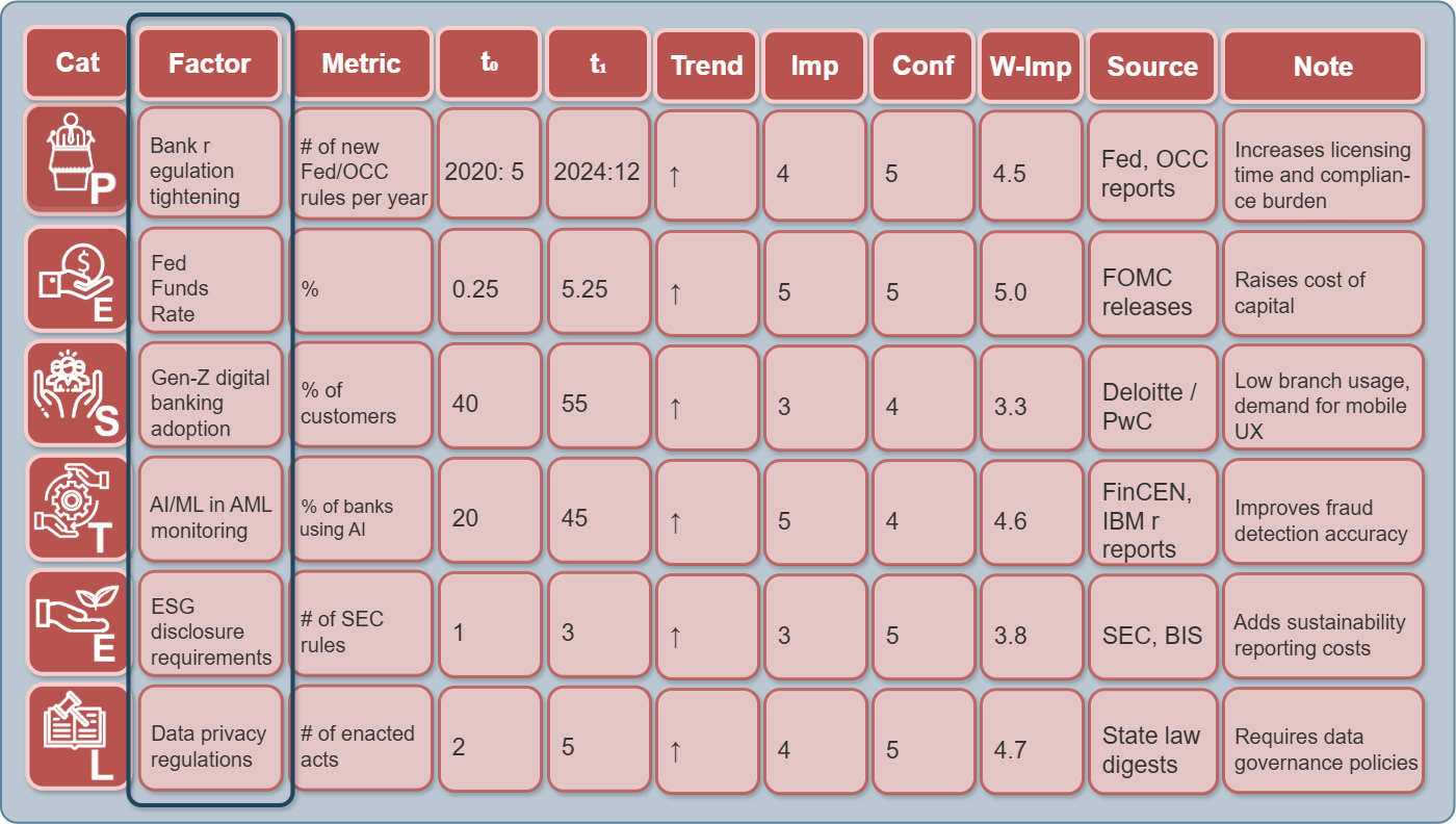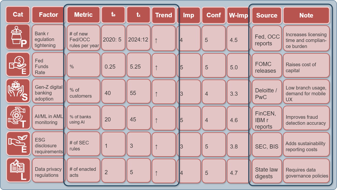 This is a real table demonstrating how external factors are distributed across the six PESTEL categories. The sample case, “launching a bank in the USA,” reflects actual data on regulation, interest rates, ESG, and AI.