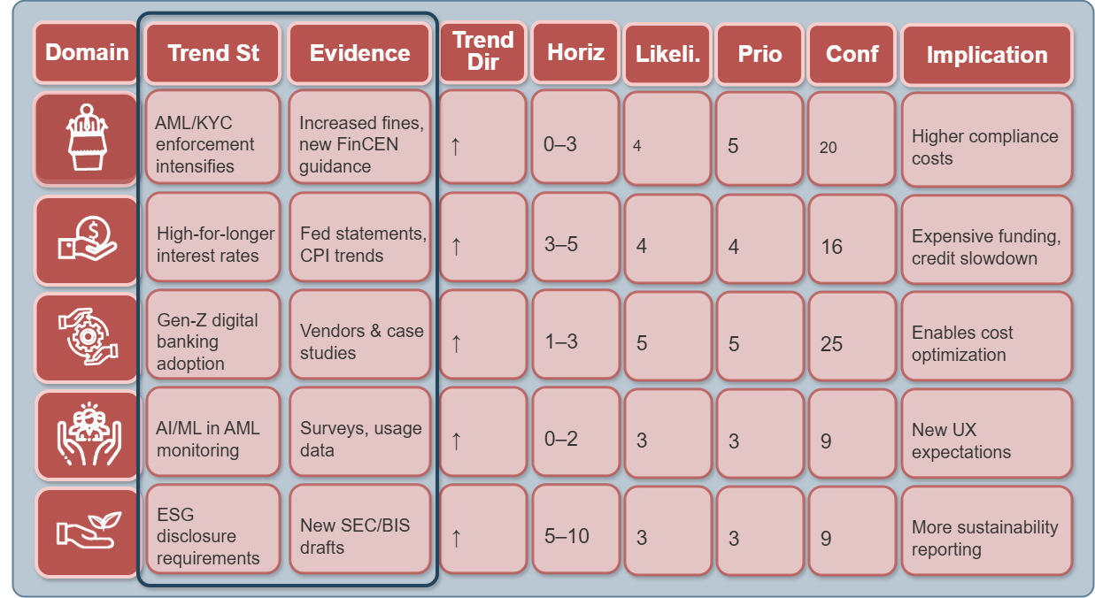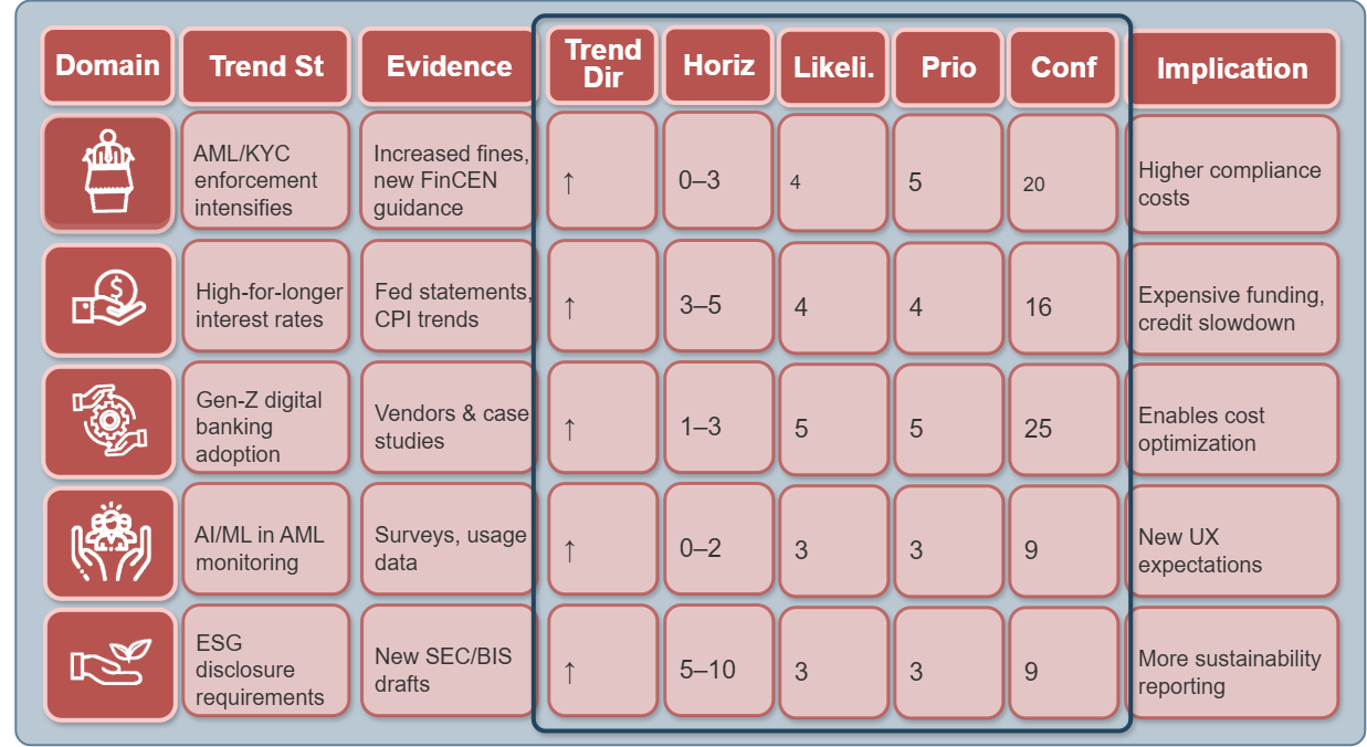 • Technological — AI/ML in AML monitoring (4.6 / 4) → Rapid adoption of AI for AML monitoring.