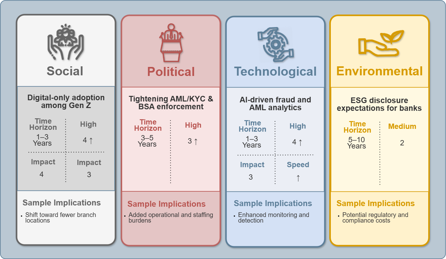 • The data sources on which the trend assessment is based (e.g., Fed, OCC, FinCEN, Deloitte).