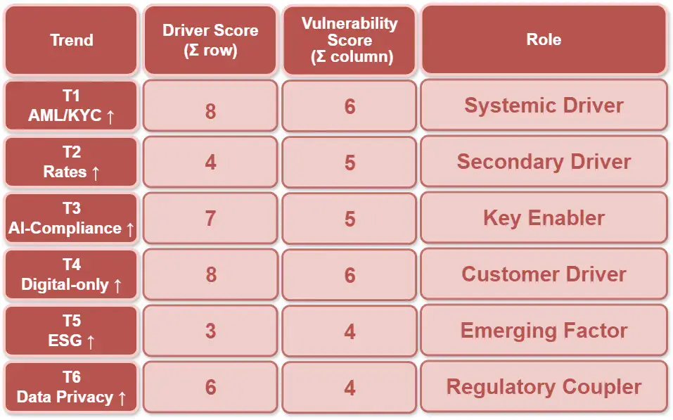 T1 (AML/KYC ↑) + T6 (Data Privacy ↑) + T3 (AI Compliance ↑ as a response to regulatory pressure)