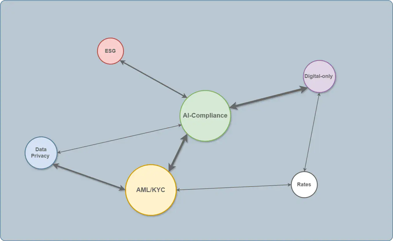 T1 (AML/KYC) → T3 (AI Compliance) — strong relationship.T5 (ESG) → T3 — moderate relationship.
