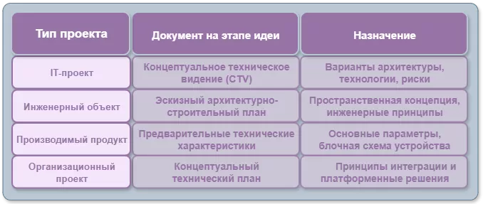 На концептуальной стадии проекта (до проектирования и реализации) подготавливается только один предварительный документ, в зависимости от типа проекта.