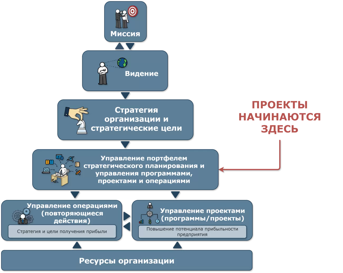 - На нижнем уровне , находятся новые цели, специфичные для каждого проекта. Эти цели уже узко ориентированы на конкретные результаты и задачи в рамках отдельного проекта. Их задача — способствовать реализации целей на уровне проекта, которые, в свою очередь, служат для достижения организационных целей и стратегий.