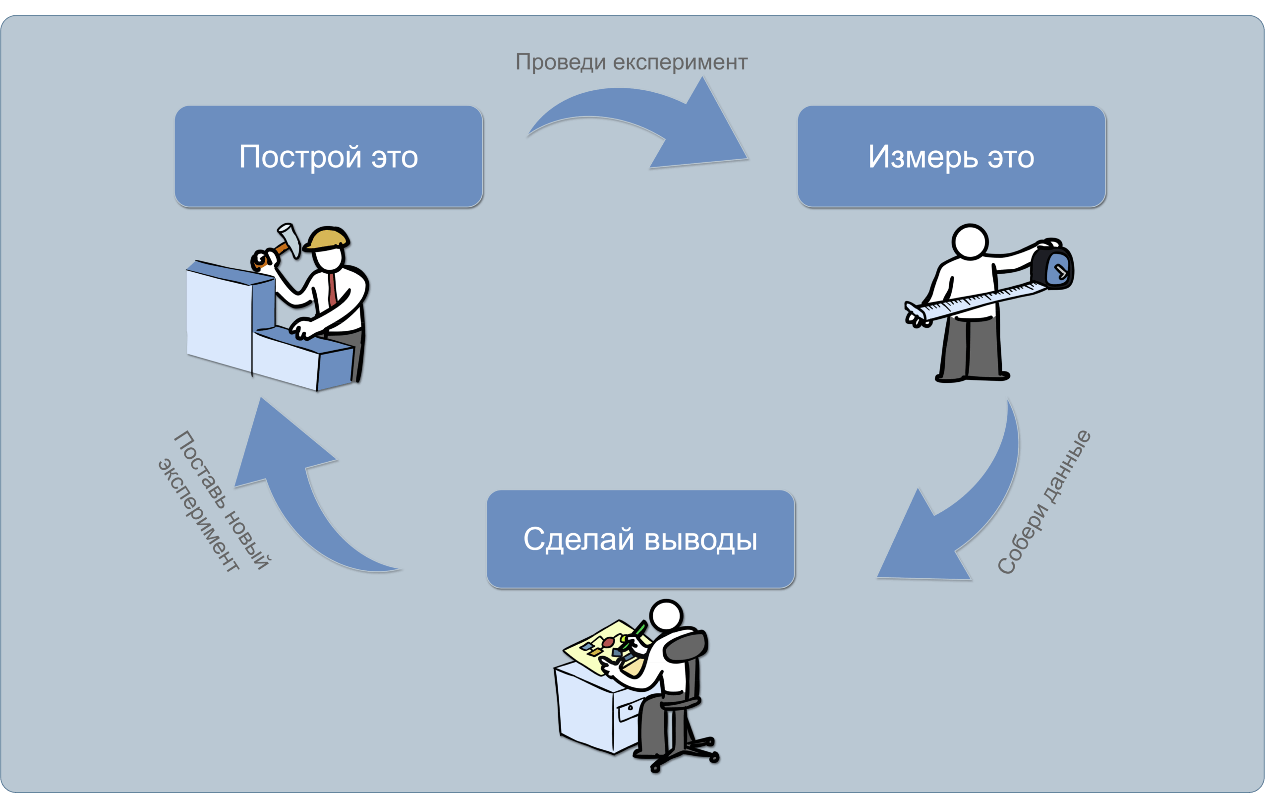 Циклический процесс Поиска и проверки гипотез состоит из этапов: создание (Build), измерение результатов (Measure) и анализ и обучение (Learn).