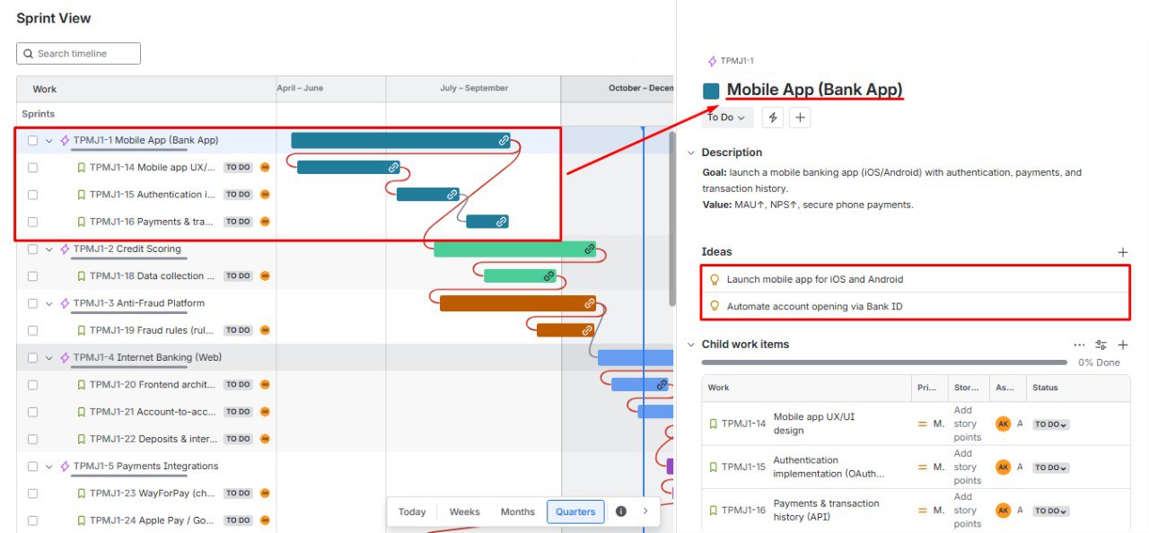 - Використовуйте Sprint View, щоб побудувати Project Roadmap,де відображені всі епіки, задачі та робочі потоки, що формують проєктну доставку.Це дає цілісне бачення того, як різні технічні та бізнес-потоки просуваються в часі.