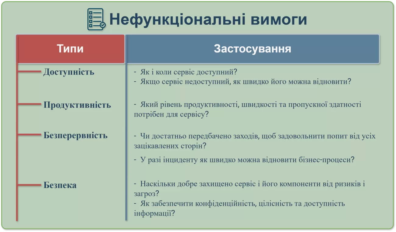 Для більш точного контролю якості нефункціональні вимоги можна розділити на категорії: