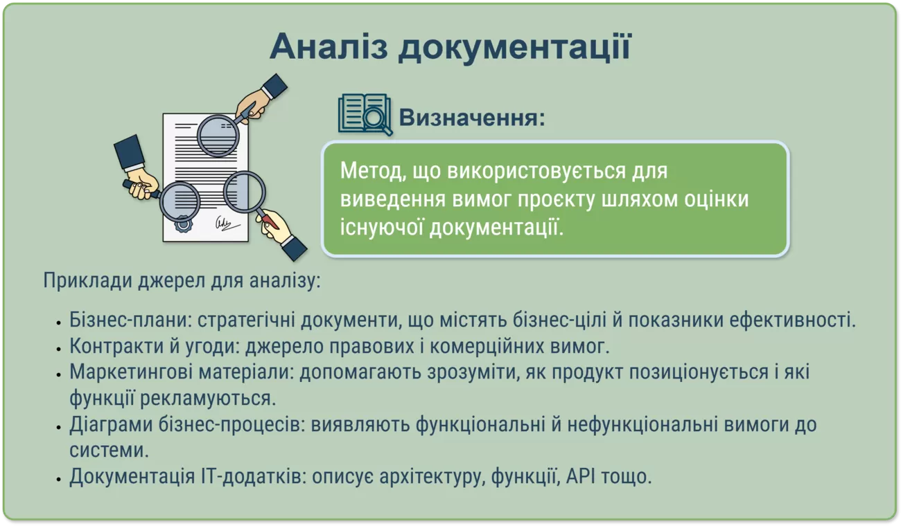 Деякі методи, такі як аналіз документації, можуть здаватися більш формальними та жорсткими за своєю природою, оскільки вони ґрунтуються на вже наявних даних. Це робить їх придатними для проєктів із чітко визначеними межами або нормативними вимогами. Наприклад, у банківських чи юридичних проєктах цей метод є базовим.