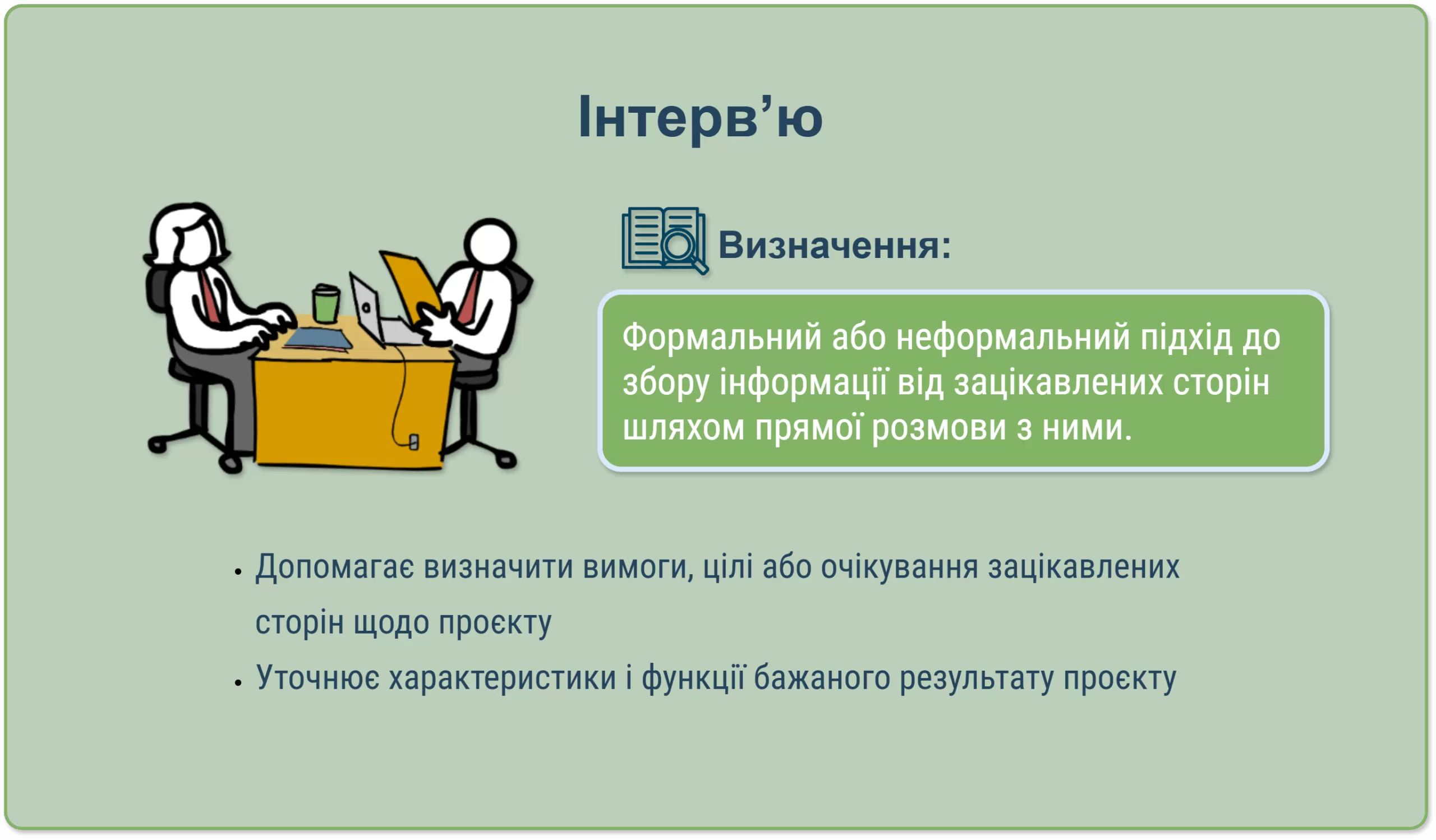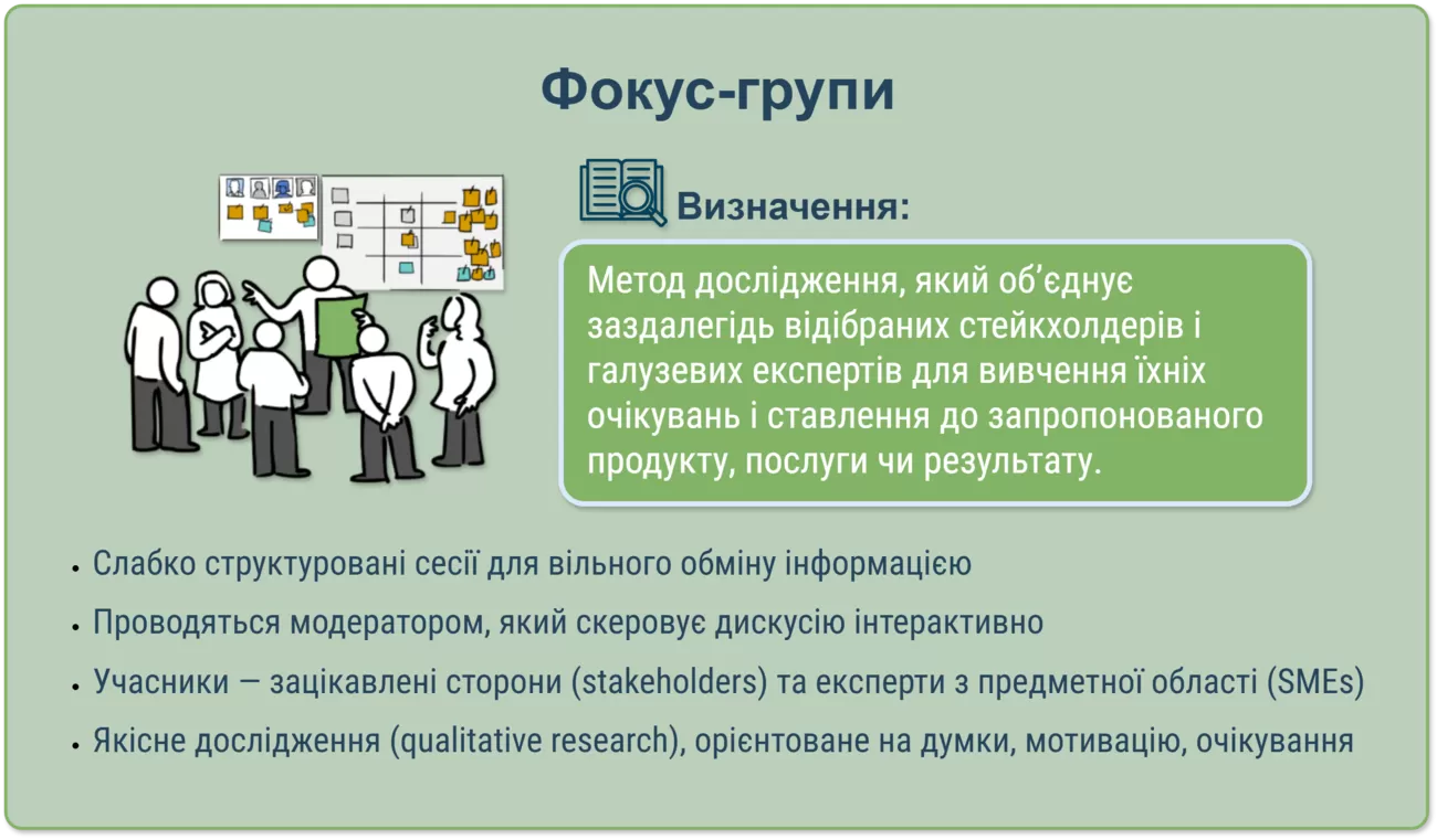 забезпечує розуміння очікувань клієнтів та зацікавлених сторін. Для цього використовуються різні методи, зокрема: аналіз документації; інтерв’ю; фокус-групи.