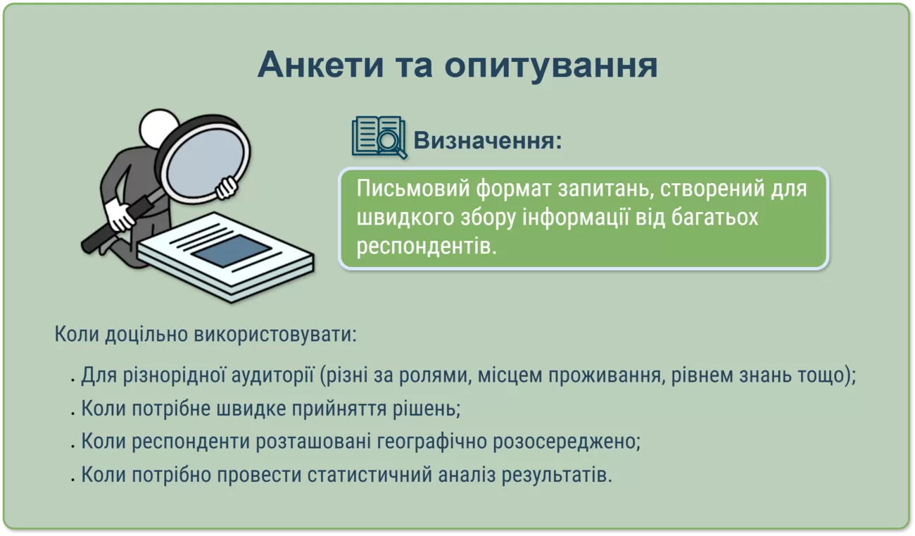 Методи, такі як анкети або опитування, спрямовані на швидкий збір інформації від відносно широкої аудиторії, але можуть бути менш глибокими порівняно з інтерв’ю чи спостереженнями, які забезпечують більш детальне розуміння очікувань і викликів. Це підкреслює, що вибір методу безпосередньо залежить від контексту проєкту: анкети ефективні для швидкого прийняття рішень за участю широкого кола зацікавлених сторін, тоді як інтерв’ю є більш цінними для отримання точних уявлень про окремі процеси та навчання.