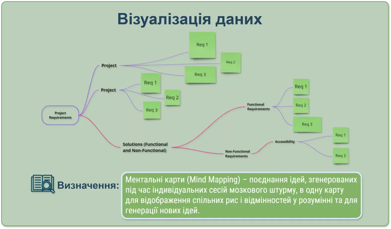 Ментальні карти — це метод поєднання ідей у єдину структуру, яка відображає їхню взаємозв’язок. На відміну від лінійних списків, майндмепи надають візуальне уявлення про те, як різні аспекти проєкту поєднуються між собою, і стимулюють появу нових ідей.