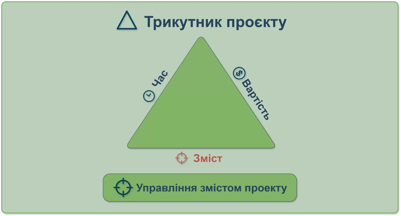 У серці кожного проєкту лежить трикутник — час, вартість і зміст. Цей трикутник регулює всі процеси, визначаючи, що буде створено, у які терміни та за якою вартістю.