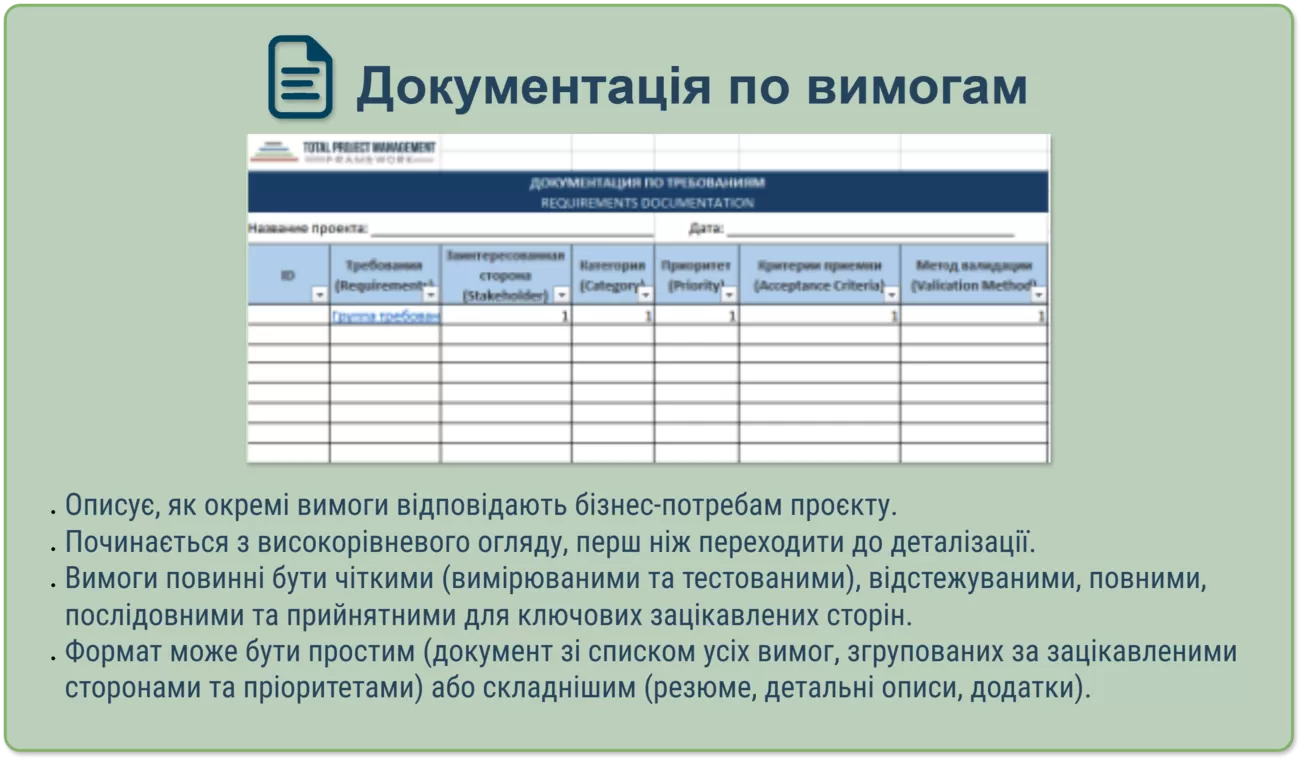 Цей документ допомагає структурувати процес збору, аналізу та документування вимог. Варто зазначити, що вимоги проєкту визначають ключові результати, яких очікують зацікавлені сторони. Матриця трасування вимог (Requirements Traceability Matrix, RTM) пов’язує вимоги з виконаними завданнями, забезпечуючи прозорість на всіх етапах реалізації проєкту.