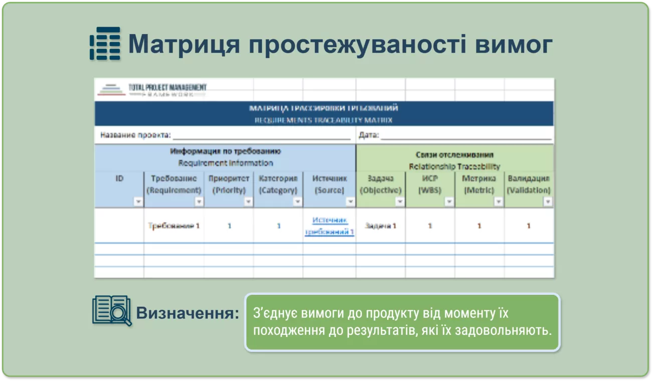 Кожна вимога в матриці має бути пов’язана з певним результатом або компонентом проєкту, що дозволяє легко перевірити її виконання.