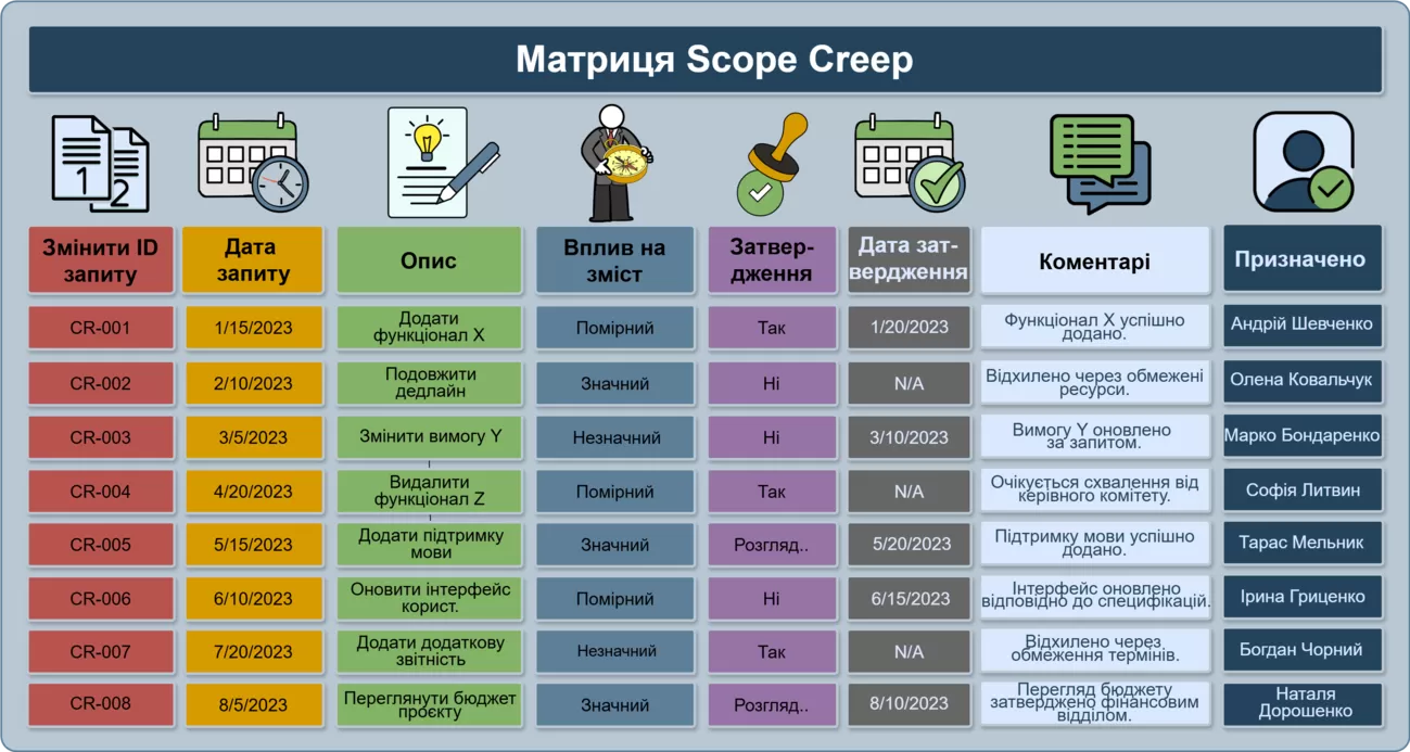 Одним із таких інструментів є Матриця Scope Creep — структурований підхід до аналізу, моніторингу та документування всіх запитів на зміни, що виникають у процесі реалізації проєкту.