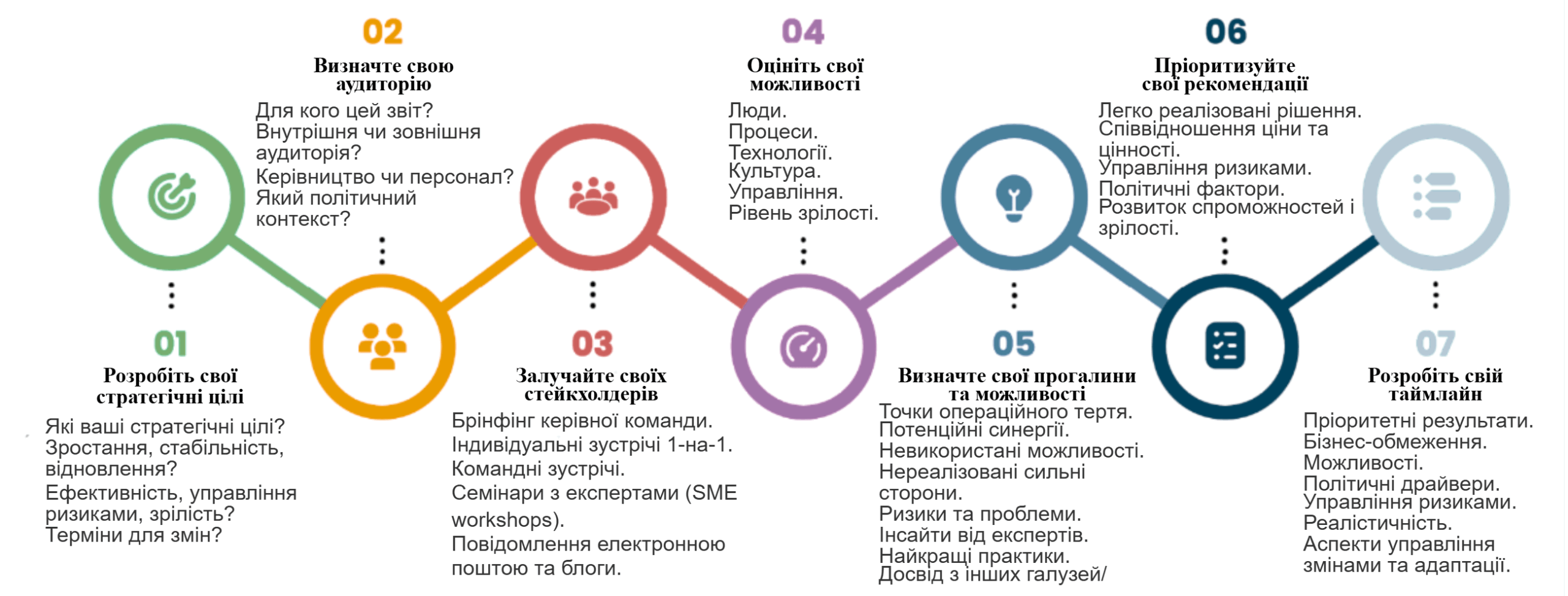 - Команди оцінюють потенційні синергії, ризики та нереалізовані можливості. Також виявляють місця, де проєкт може зіткнутися з операційними труднощами.